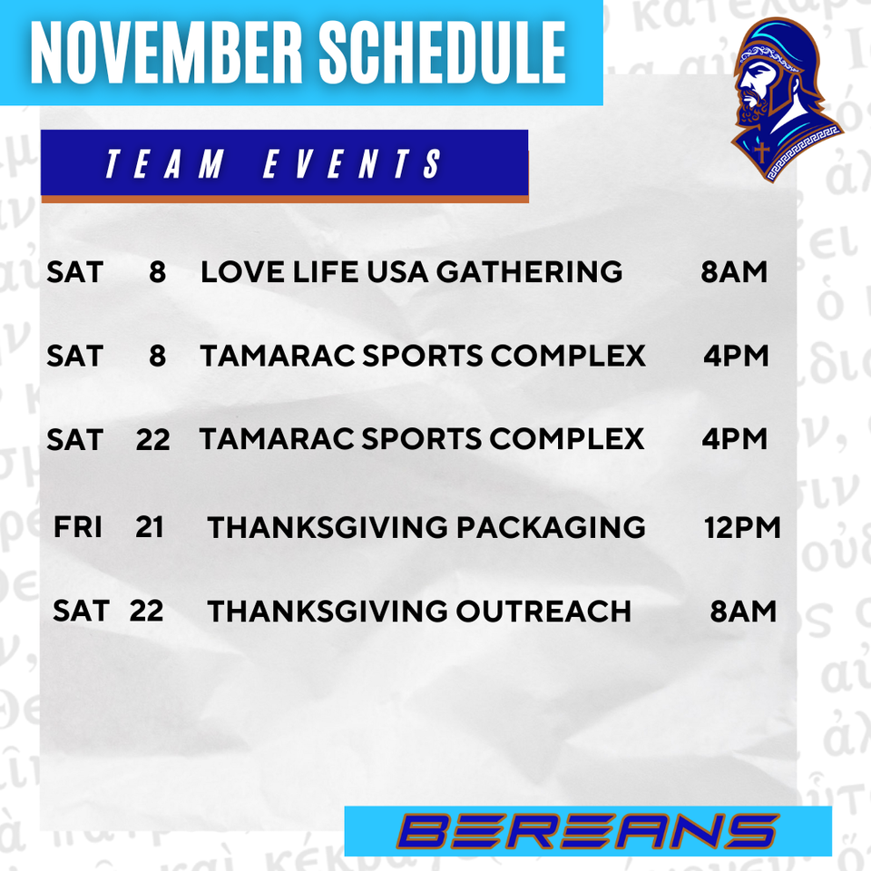The Florida Bereans have released their official November schedule, packed with both team activities and community outreach events. The organization continues to demonstrate its commitment to excellence on and off the field — blending preparation, service, and fellowship throughout the month.