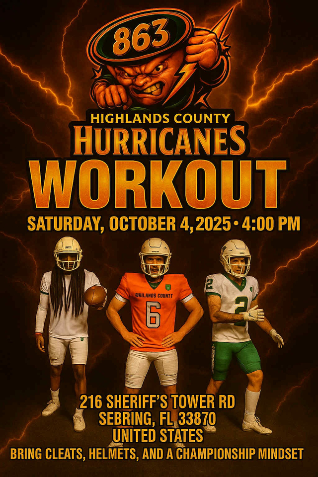 The Highlands County Hurricanes are continuing preparations for the upcoming season with a scheduled team workout on Saturday, October 4, 2025, at 4:00 PM. The session will be held at 216 Sheriff’s Tower Rd, Sebring, FL 33870.