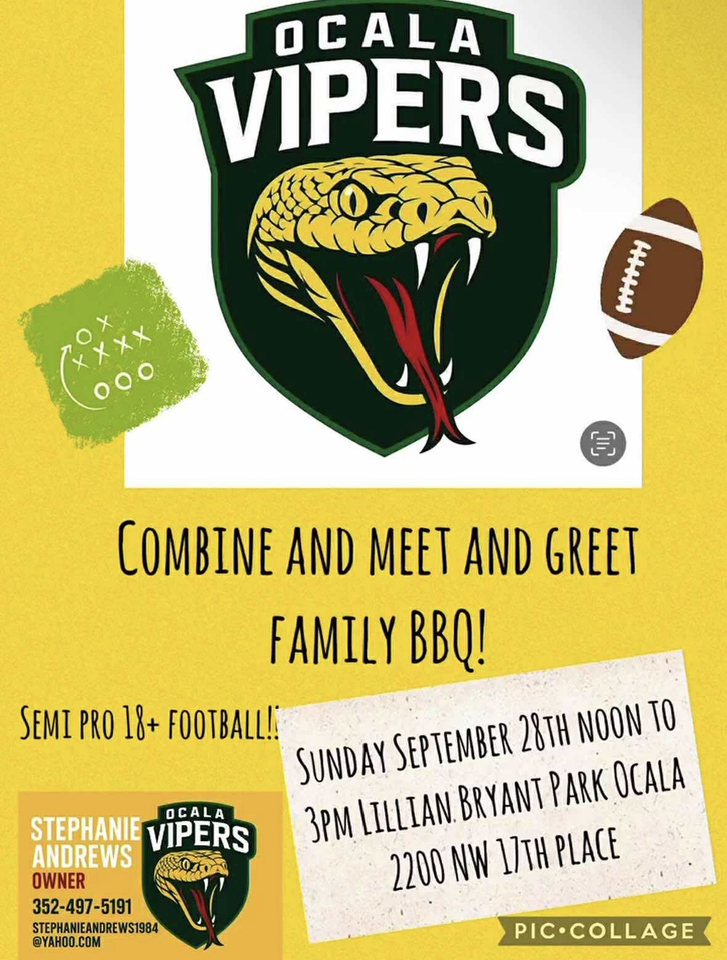 The Ocala Vipers are hosting a combined player combine and family meet-and-greet BBQ on Saturday, September 28, from 12:00 PM–3:00 PM at Lillian Bryant Park (2200 NW 17th Place, Ocala, FL).