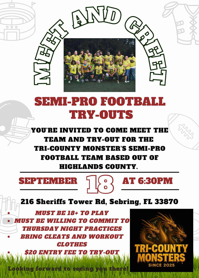 The Tri-County Monsters will be holding their official meet and greet/tryouts on Thursday, September 18, at 6:30 PM. The event will take place at 216 Sheriffs Tower Rd, Sebring, FL 33870.
